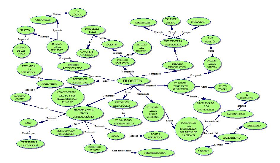 En el mapa conceptual que sigue, de la Filosofía; esquema 1.1 se puede ver a grande rasgos el desarrollo que ha tenido la filosofía occidental, desde la época de los griegos hasta los tiempos actuales, los sistemas que se generaron y continuidad.